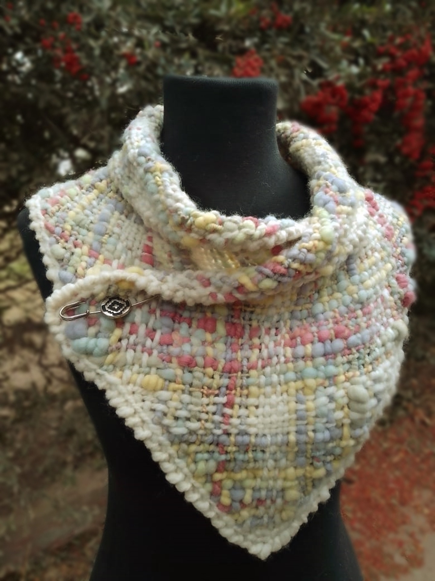 With this technique you can get pieces such as neck warmers, table runners, shawls, ponchos and and what you can imagine! The woven fabric is light and elastic and colored threads combine in amazing ways. The loom is perfect for weaving with medium/chunky and bulky gauge yarn, art yarn and fancy yarns.